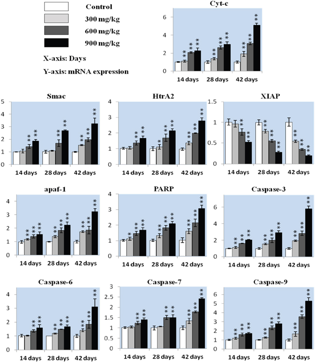 Figure 3: Cyt-c, Smac, HtrA2, XIAP, apaf-1, PARP caspase-3, caspase-6, caspase-7 and caspase-9 mRNA in the kidney. Data are presented as means ± standard deviation (n=5). *P<0.05, **P<0.01 compared with the control group.