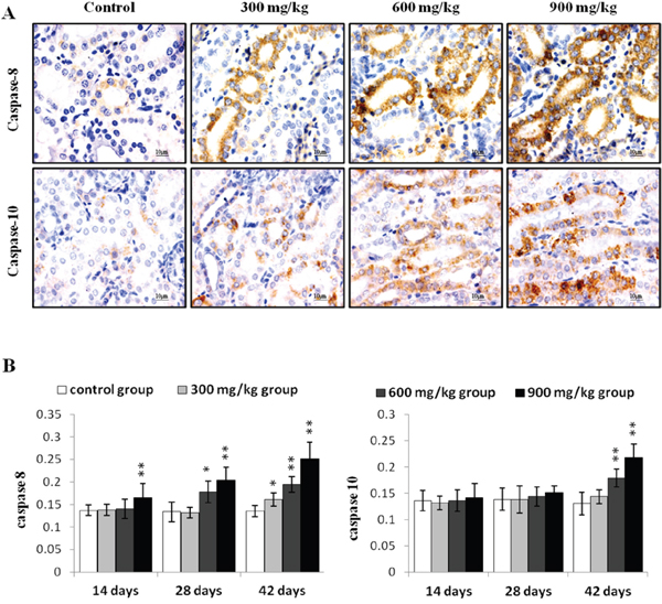 Figure 6: Immunohistochemical analysis of caspase-8 and caspase-10 in the kidney. A. Representative immunohistochemical staining results for caspase-8 and caspase-10 in the kidney at 42 d. B. Quantification of caspase-8 and caspase-10 protein levels in the kidney. Data are presented as means ± standard deviation (n=5×5). *P<0.05, **P<0.01 compared with the control group.