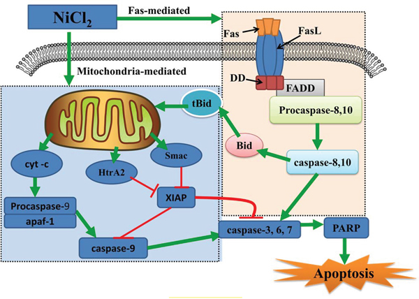 Figure 7: Schematic diagram of NiCl2-induced mitochondria- and Fas-mediated caspase-dependent apoptosis. NiCl2 increases the cyt-c, Smac and HtrA2 release from the mitochondria into the cytosol. Cyt-c cleaves and activates caspase-9, which in turn cleaves and activates downstream caspases, such as caspase-3, 6 and 7. Caspase-3, 6 and 7 cleave PARP, which then induces apoptosis. Concurrently, Smac and HtrA2 inhibit XIAP expression, also contributing to apoptosis. NiCl2 also promotes Fas and Fas ligand interactions, leading to activation of caspase-8 and casapase-10. Activated caspase-8 and 10 can directly cleave and activate downstream effector proteases, such as caspase-3, 6 and 7, leading to apoptosis.