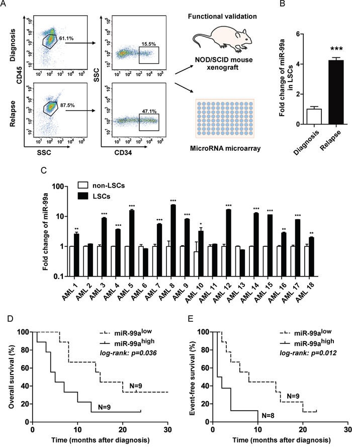 In this study, relapse-related miRNA expression signature was firstly analyzed by miRNA array in enriched CD34+ LSCs obtained from paired bone marrow (BM) samples from an AML patient at initial diagnosis and relapse, and miR-99a was the most significantly upregulated miRNA in LSCs at relapse stage compared to the initial diagnosis. We also observed that miR-99a was highly amplified in LSCs compared to non-LSCs in a cohort of 18 AML patients, and the high expression levels of miR-99a were associated with the poor prognosis of patients with AML. These results point to the importance of a novel role of miR-99a in LSC activity and disease prognosis.