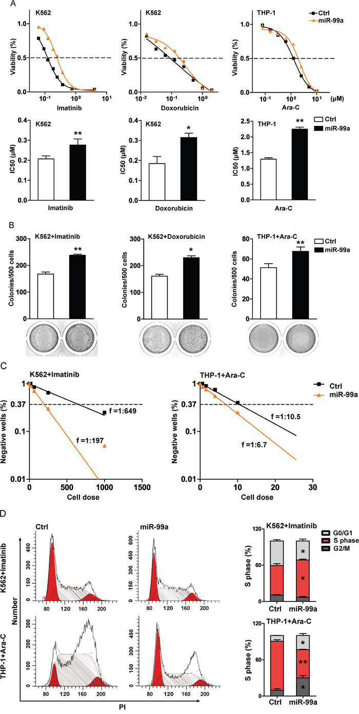 Figure 3: Ectopic miR-99a expression promotes leukemic cell survival after exposure to chemotherapeutic agents in vitro. A. K562 and THP-1 cells transduced with miR-99a and Ctrl viruses were treated with increasing concentrations of imatinib, doxorubicin, or Ara-C for 72 hrs, respectively. Results were expressed as viability percentage relative to the untreated group. IC50 values were calculated with GraphPad Prism software, which was marked in the middle of the bottom and top plateau. Data are presented as mean ± SD, and represented one of four independent experiments. *p<0.05, **p<0.01. B. CFC assays of cells after drug treatment. K562/miR-99a and K562/Ctrl cells were exposed to 0.12 μM imatinib or 0.02 μM doxorubicin for 24 hrs, THP-1/miR-99a and THP-1/Ctrl cells were exposed to 1.25 μM AraC for 24 hrs, and followed by culturing in methylcellulose medium (7 days for K562 and ten days for THP-1). Data are presented as mean ± SD, and represented one of three independent experiments. *p<0.05, **p<0.01. C. The frequency of resistant cells was estimated by limiting-dilution assay. K562/miR-99a and K562/Ctrl cells were exposed to 0.25 μM imatinib for 14 consecutive days. THP-1/miR-99a and THP-1/Ctrl cells were previously incubated for 24 hrs with 1.25 μM Ara-C, washed, and then cultured for another 14 days. Individual wells were considered negative if there was no cell growth after two weeks. Data represented one of two independent experiments. D. Cell-cycle distribution of cells after drug treatment. K562 and THP-1 cells transduced with miR-99a and Ctrl viruses were treated with imatinib and Ara-C, respectively. Representative flow cytometry histograms show the cell-cycle distribution in cells posts treatment by PI staining (left panel). Quantitation of cell-cycle distribution is shown in (right panel). Data are presented as mean ± SD, and represented one of three individual experiments. *p<0.05, **p<0.01.