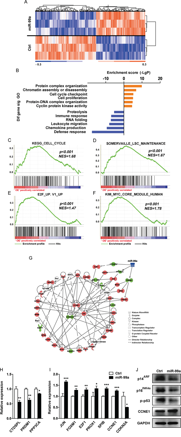 Figure 5: Gene profiling analyses showed differentially expressed gene upon miR-99a overexpression. A. Heat map of microarray analysis of the significantly different expression levels of mRNA between THP-1/Ctrl and THP-1/miR-99a groups. (n=3 per group, p<0.05, fold-change ≥1.2). B. GO analysis of microarray data. Selected significant ontology terms are shown. C-F. GSEA analyses of gene expression profile in miR-99a versus Ctrl cells. The enrichment score plots corresponded to the KEGG cell cycle gene set (C), the LSC maintenance signature gene set (D), E2F-induced upregulated gene set (E), and the MYC core module gene set (F). The normalized enrichment score (NES) and p-values are shown. G. Representative protein-protein interaction network of proliferation/survival related genes based on the IPA database. Node shape corresponds to molecular function type. Node color corresponds to up-regulation (red) or down-regulation (green). Visualization was done using IPA software. H-J. Relative expression levels of miR-99a candidate targets (H), key downstream genes (I) were confirmed by qPCR and protein expression of relevant differentially expressed genes was analyzed by Western blot (J). Data are presented as mean ± SD and represented one of two independent experiments. *p<0.05, **p<0.01, ***p<0.001.