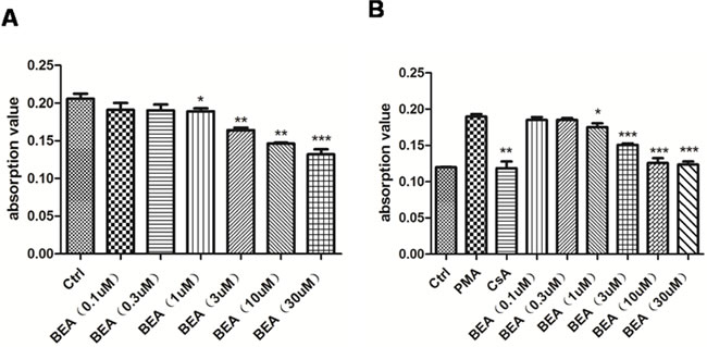 Figure 1: BEA inhibited PMA-induced lymphocytes proliferation in a dose-dependent manner. A. The inhibition effect of BEA on the proliferation of lymphocytes. Data are presented as mean±SD of triplicates. Statistical analysis between control group (Ctrl) and BEA treatment groups at indicated concentrations was determined by student’s t-test. Significance level was labeled as: * P <0.05; ** P <0.01; *** P<0.001. B. The inhibition effect of BEA on the PMA-induced lymphocytes proliferation. Data are presented as mean±SD of triplicates. Statistical analysis between PMA group and CsA or BEA treatment groups was determined by student’s t-test. Significance level was labeled as: * P <0.05; ** P <0.01; *** P<0.001.