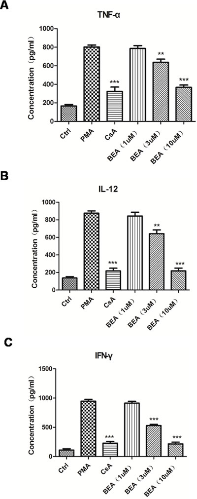 Figure 2: BEA inhibited PMA-induced up-regulation of inflammatory mediators of lymphocytes. The levels of TNF-α A., IL-12 B. and IFN-γ C. released by lymphocytes under different treatments were examined using ELISA kits as described above. Data are presented as mean±SD of triplicates. Statistical analysis between PMA group and CsA or BEA treatment groups was determined by student’s t-test. Significance level was labeled as following: ** P <0.01; *** P <0.001.