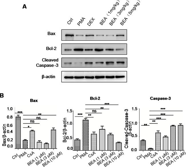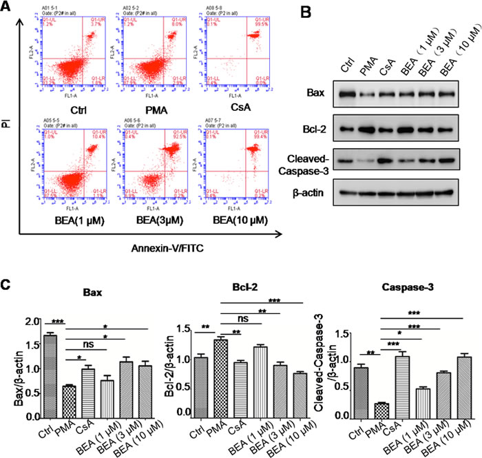 Figure 3: BEA inhibited PMA-induced cell apoptosis by up-regulating Bax and caspase-3 and down-regulating Bcl-2 in lymphocytes. A. Lymphocytes under different treatments were stained with Annexin-V and PI and analyzed by Flow cytometry. B. Western blotting analysis of Bax, Bcl-2 and cleaved Caspase-3 in lymphocytes. C. Quantitative analysis of Western blotting results. Specific protein expressions were normalized to the levels of β-actin. Data are presented as mean±SD of three experiments. Statistical analysis between highlighted groups was determined by student’s t-test. Significance level was labeled as: ns; P >0.05; * P <0.05; ** P <0.01; *** P <0.001.