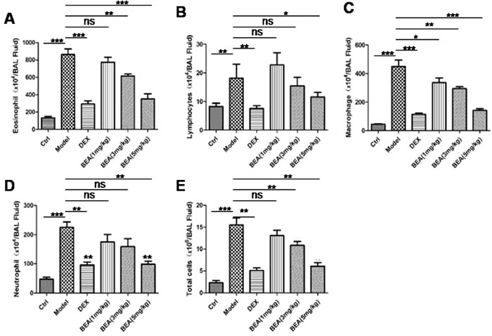 Figure 4: BEA reduced the numbers of eosinophils, lymphocytes, macrophages, neutrophils and total cells in mice BALF. The numbers of eosinophils A., lymphocytes B., macrophages C., neutrophils D. and total cells E. in mice BALF. Data are presented as mean±SD of 8 mice each group. Statistical analysis between highlighted groups was determined by student’s t-test. Significance level was labeled as: ns; P >0.05; * P <0.05; ** P <0.01; *** P <0.001.