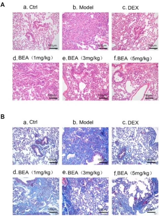 Normal lung tissue had few inflammatory cell infiltration and collagen was seem only around the basement membrane of bronchial epithelia and blood vessels. In mice with asthmas, lung tissue had increased inflammatory cell infiltration and deposition of collagen were seen not only in basement membrane of bronchial epithelia and blood vessels, but also in lung parenchyma, indicating the increased proliferation of fibroblasts and increased secretion of collagen. DEX treatment decreased inflammatory cell infiltration and collagen deposition. Low dose BEA (1mg/kg) had little effect in reducing inflammatory cell infiltration and collagen deposition. However, high dose BEA (3mg/kg) reduced the inflammatory cell infiltration and collagen deposition. BEA at 5mg/kg greatly reduced the inflammatory cell infiltration and collagen deposition (Figure 7).
