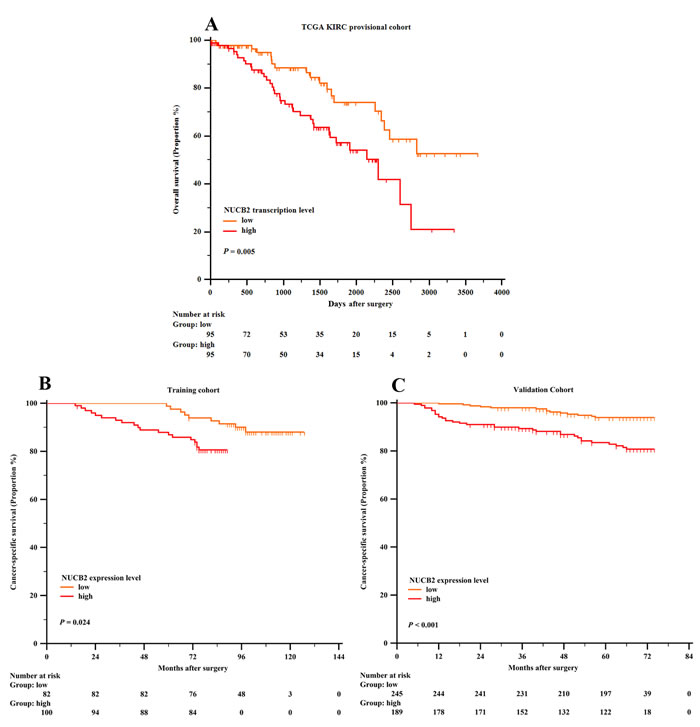 As summarized in Table 1, the patient’s characteristics and NUCB2 expression from training set (n = 182), validation set (n = 434) and TCGA KIRC cohort (n = 190) were summarized in the study. The ECOG and tumor necrosis data of TCGA KIRC cohort were of incompleteness. NUCB2 expression was shown to be positively associated with higher Fuhrman grade both in the training cohort and validation cohort (P = 0.002 and P = 0.001, respectively). Furthermore, NUCB2 high expression was correlated with worse ECOG PS score (P = 0.004) and presence of necrosis (P < 0.001) in the validation set. In the TCGA KIRC cohort, higher mRNA transcription level was correlated with higher T stage (P = 0.017).