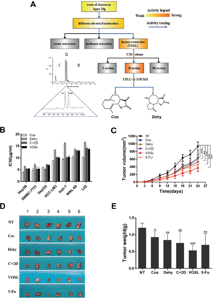Figure 1: Therapeutic effects of VOSL and its main active ingredients on liver cancer. A. A flow diagram of VOSL isolation and identification of its active ingredients using a bioactivity-oriented screening platform. B. Cell lines were exposed to Cos, Dehy, C+2D and VOSL for 48 h. Cell viability was measured by MTT assay and the IC50 value of the tested samples was calculated using the Trimmed Spearman-Karber Method. C. SMMC-7721 cells were injected subcutaneously into the axillary fossa of nude mice until the tumors reached about 2-3 mm in diameter. The mice were treated with Cos, Dehy, C+2D, VOSL and 5-FU at the indicated concentrations, n=6 in every group. Tumor volume was measured and compared; **p < 0.01 and ***p < 0.001 compared with the negative control (NT) group. D and E. The tumors were harvested and weighed after 24 times of administrations; *p < 0.05, **p < 0.01 and ***p < 0.001 compared with the NT group.