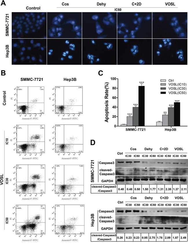 Figure 3: VOSL induces HCC cell apoptosis. A. Apoptotic changes induced by IC50 of Cos, Dehy, C+2D snd VOSL treatments for 48 h were observed by Hoechst 33342 staining in HCC cells. B and C. Apoptotic cells were determined by flow cytometry. The apoptotic percentages were presented as mean ± SD; **p < 0.01 and ***p < 0.001 compared with the control group. D. The Caspase3 and cleaved-Caspase3 levels in HCC cells were examined by Western blot after 48 h treatment.
