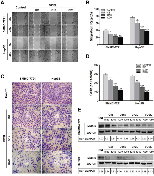 Figure 4: VOSL inhibits the motility activity of HCC cells. A and B. HCC cells were treated with VOSL (IC5, IC10, IC20) for 48 h, and the effect of VOSL on cell migration was measured by scarification test. The migration rates of HCC cells were presented as mean ± SD; *p < 0.05, **p < 0.01 and ***p < 0.001 compared with the control group. C and D. After incubation with VOSL at IC5, IC10 and IC20 for 48 h, the invasive property of HCC cells was tested in Transwell plates; original magnification 200×. The invasive cells were presented as mean ± SD; **p < 0.01 and ***p < 0.001 compared with the control group. E. HCC cells were treated with Cos, Dehy, C+2D or VOSL (IC30, IC50) for 48 h, and then the expression level of MMP-9 in HCC cells was examined by Western blot.