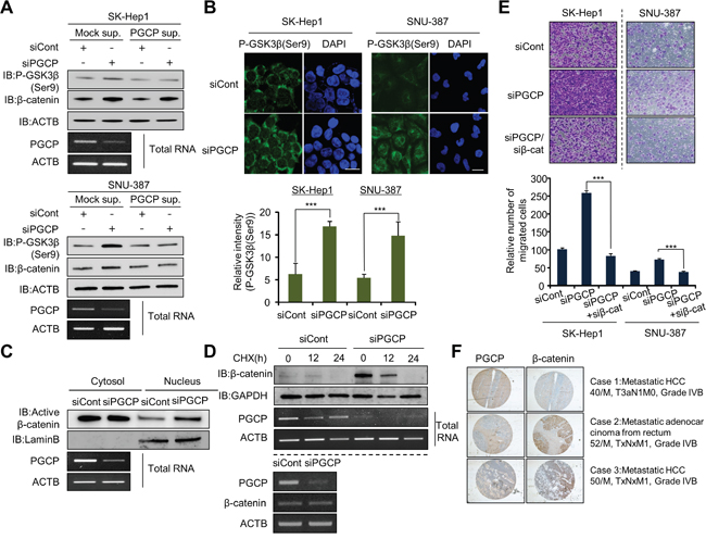 Figure 2: PGCP knockdown increases phosphorylation of GSK3β. A. Western blot analysis of phospho-GSK3β (Ser9) and β-catenin. PGCP supernatant was added to cultured SK-Hep1 and SNU-387 cells treated with siCont or siPGCP. Whole cell lysates were prepared and analyzed by western blotting using the indicated antibodies. ACTB was used as a loading control. B. Immunofluorescence of phospho-GSK3β (Ser9). The cells treated with siCont or siPGCP were fixed with methanol and stained with anti-phospho-GSK3β (Ser9) (Alexa Fluor 488, green) antibody and DAPI (blue). Scale bar, 20 μm. The signal intensities corresponding to phospho-GSK3β (Ser9) were quantified using the ImageJ software (bottom). The p values were calculated using Student’s t-test (***p<0.001. C. Western blot analysis of β-catenin. The whole cell lysates were prepared form SK-Hep1 cells treated with siCont or siPGCP and separated into nuclear or cytosolic fractions using a nuclear and cytoplasmic extraction reagent (NE-PER, Thermo). The purity of cell fractionation was monitored by Lamin B. D. Detection of PGCP and β-catenin by Western blotting and RT-PCR. Top, Cells were treated with 100 μg/ml of cycloheximide (CHX) for the indicated times and immunoblotted to examine β-catenin levels after treatment with siCont or siPGCP. Anti-GAPDH antibody was used as an internal control. Bottom, The expression level of PGCP and β-catenin was measured by semi-quantitative RT-PCR after PGCP depletion in SK-Hep1 cells. ACTB was used as an internal control. E. Cell migration assays in SK-Hep1 and SNU-387 cells. After 24 h, migrated cells were fixed with methanol and stained with crystal violet. The p value was calculated using Student’s t-test (***p<0.001). F. Inverse correlation between expression of PGCP and β-catenin in human liver cancer tissues. Immunohistochemical analysis of PGCP and β-catenin. Liver cancer samples were purchased from SUPER BIO CHIPS. Negative correlation of staining between PGCP and β-catenin was calculated using Spearman’s correlation coefficient by ranks with ties.