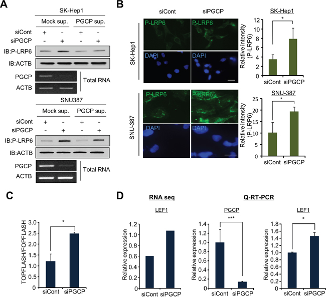 Figure 3: PGCP knockdown induces phosphorylation of LRP6. A. Detection of phospho-LRP6 by Western blotting. SK-Hep1 and SNU-387 cells treated with siCont or siPGCP were incubated with supernatant including overexpressed PGCP recombinant proteins for 24 h. Western blot analysis was performed with antibodies against LRP6 phosphorylation. ACTB was used as an internal control. B. Immunofluorescence analysis of phospho-LRP6 after treatment with siPGCP and siCont. DAPI was used to counterstain nuclei. The signal intensity corresponding to phospho-LRP6 was quantified using the ImageJ software (Right). The p values were calculated using Student’s t-test (*p<0.05, ***p<0.001). C. TOPFLASH and FOPFLASH analysis in SK-Hep1 after treatment with siCont or siPGCP. The results are expressed as the ratio of TOPFLASH over FOPFLASH activity, and the p value was calculated using Student’s t-test (*p<0.05). D. Relative expression of LEF1 analyzed by RNA-seq (left), and validation of RNA-seq data using quantitative RT-PCR analysis (right). The p values were calculated using Student’s t-test (*p<0.05, ***p<0.001).