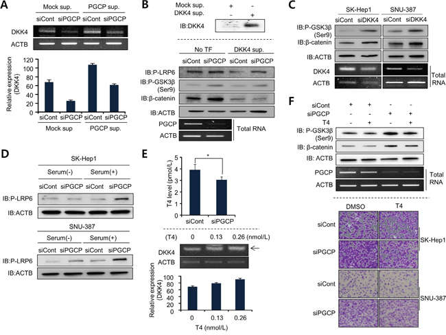 Figure 4: PGCP transcriptionally modulates DKK4 expression in a T4-dependent manner. A. Semi-quantitative RT-PCR analysis of DKK4 expression in SK-Hep1 cells treated with PGCP supernatant after PGCP knockdown. ACTB was used as an internal control (top). The signal intensity corresponding to DKK4 was quantified using the ImageJ sofware (bottom). B. Western blot analysis after the DKK4 addition to PGCP knockdown cells. Top, Western blot analysis after transfection with FALG-Mock or FLAG-DKK4, respectively. After 24 h, the culture media including overexpressed DKK4 recombinant proteins was concentrated using an Amicon column. The samples were immunoblotted with anti-DKK4 antibody. Bottom, SK-Hep1 cells were treated with siRNAs (siCont and siPGCP) for 48 h, and secreted DKK4 was added to the culture media. After 24 h, Western blot analysis was performed using the indicated antibodies. ACTB was used as an internal control. C. Detection of phospho-GSK3β (Ser9) and β-catenin after siDKK4 silencing in SK-Hep1 and SNU-387 cells. Western blot analysis was performed using the indicated antibodies. ACTB was used as an internal control. D. Detection of phospho-LRP6 by Western blotting. SK-Hep1 and SNU-387 cells treated with siCont or siPGCP were grown with or without serum. Whole cell lysates were analyzed by Western blotting using the indicated antibodies. ACTB was used as a loading control. E. T4 assay using a Human Free Thyroxine ELISA kit. SK-Hep1 cells treated with siCont or siPGCP were cultured for 48 h. The p value was calculated using Student’s t-test (*p<0.05) (top). Quantitative RT-PCR analysis of DKK4 mRNA level after T4 treatment for 24 h. ACTB was used as a loading control. The signal intensity corresponding to DKK4 was quantified using the ImageJ software (bottom). F. Detection of phospho-GSK3β (Ser9) and β-catenin. Western blot analysis was performed after treatment with T4 (final 100 ng/ml) in siRNA-treated SK-Hep1 cells using the indicated antibodies. ACTB was used as an internal control (top). Cell migration assay after T4 treatment. Cells treated with siCont or siPGCP were incubated with T4 (final 100 ng/ml) for 12 h before cell migration assay. DMSO was used as a negative control (bottom).