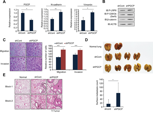 Figure 5: Knockdown of PGCP promotes lung metastasis in vivo. A. Quantitative RT-PCR analysis of PGCP, N-cadherin and vimentin cDNA was isolated from shCont and shPGCP stable cell lines. The p values were calculated using Student’s t-test (*p<0.05, **p<0.01). B. Western blot analysis of phospho-LRP6, phospho-GSK3β (Ser9) and β-catenin. ACTB was used as an internal control. C. Migration and invasion assay with shCont and shPGCP cells. Migrating and invasive cells were fixed with methanol after 24 h stained with crystal violet. The p values were calculated using Student’s t-test ***p <0.001. D. Gross lung metastases. shCont and shPGCP cells (2 × 106) were injected into BALB/c nude mice through tail vein, and lung metastases were assessed 4 weeks after injection (n=5 per group) (top). Quantification of metastatic nodules (bottom). p values were calculated using Student’s t-test *p <0.05. E. Representative images of hematoxylin and eosin staining of lung metastases. T, tumor.