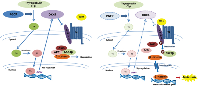 In conclusion, we report for the first time that PGCP blocks liver cancer metastasis through the inactivation of Wnt/β-catenin signaling by regulating DKK4 expression and thus may represent an effective target for control of liver metastasis (Figure 6). We also suggest that serum concentrations of PGCP or T4 may be used as potential diagnostic markers for the prediction of liver cancer development and metastasis.