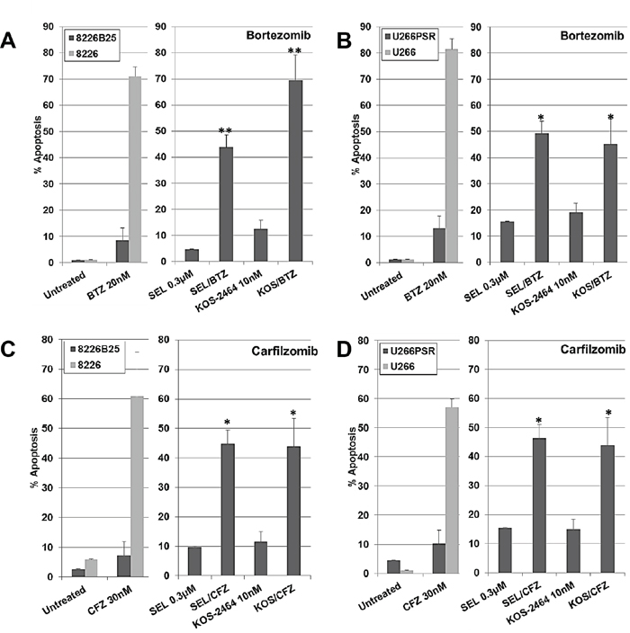 Figure 1: XPO1 inhibition sensitizes PI-resistant human multiple myeloma (MM) cell lines to bortezomib (BTZ) and carfilzomib (CFZ). Human U266 B/D. and 8226 A/C. drug-resistant and parental MM cell lines were treated concurrently for 20 h with selinexor (300 nM) or KOS-2464 (10 nM) +/- BTZ (20 nM) or +/- CFZ (30 nM) and assayed for apoptosis by flow cytometry (activated caspase 3). Resistant MM cell lines were up to 10-fold resistant to single-agent BTZ or CFZ compared with parental cells. The addition of the XPO1 inhibitors selinexor (SEL) or KOS-2464 sensitized drug-resistant cells to BTZ or CFZ compared with single-agent BTZ or CFZ (*p = 0.0054, **p = 0.0017). All cells were grown at log-phase growth conditions (5x105 cells/mL).