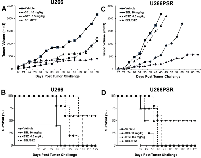 Figure 2: NOD/SCID-γ (NSG) mouse in vivo studies. NSG mice (n=5 per group) were challenged subcutaneously with 107 U266 (A/B) or 106 proteasome inhibitor (PI)-resistant U226PSR (C/D) human MM cells. Mice were treated twice weekly (Monday, Thursday) with selinexor +/- BTZ. selinexor was administered by oral gavage and BTZ by intraperitoneal injection. A/C. Tumor growth with selinexor and BTZ. BTZ/selinexor combination reduced tumor growth compared with single-agent BTZ (P = 0.022) or vehicle control (P = 0.0014). B/D. Survival with selinexor and BTZ. In NSG mice challenged with U266 tumors, selinexor/BTZ treatment improved survival compared with vehicle (P = 0.0006) or single-agent selinexor (P = 0.0010) or BTZ (P = 0.0072). Treatment of PI-resistant PSR tumors with selinexor/BTZ also improved survival compared with vehicle control (P = 0.0001) and single-agent BTZ (P = 0.0001) or selinexor (P = 0.0085). Toxicity, assessed by weight loss (<10%), was minimal in all treatment groups.