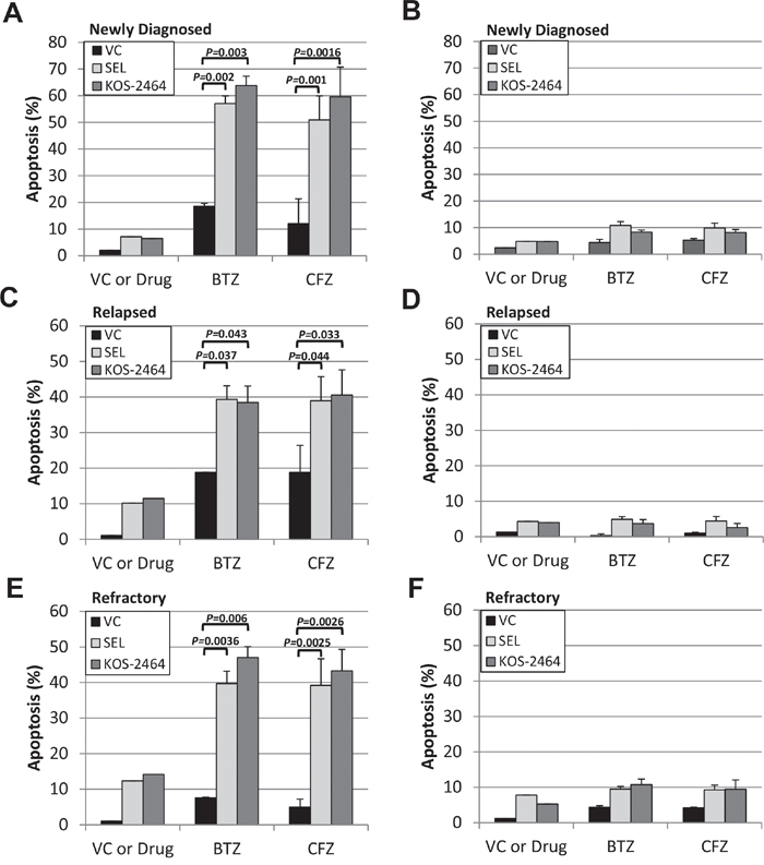 Using flow cytometry, we gated on the CD138/light-chain immunoglobulin double-positive myeloma cell population in patient bone marrow aspirates. Apoptosis, as measured by activated caspase 3 expression showed that newly diagnosed (n=8), relapsed (n=5), and bortezomib (n=8)/carfilzomib (n=6) refractory MM patient samples were sensitized by selinexor and KOS-2464 to both bortezomib (P = 0.043 to 0.002) and carfilzomib (P = 0.044 to 0.001) (Figure 3A, 3C, and 3E). When gating on the CD138/light-chain double-negative non-myeloma cells, we found that they were not sensitized to apoptosis by XPO1 inhibitors (Figure 3B, 3D, and 3F). These data indicate that myeloma cells were targeted by the XPO1 inhibitor/PI drug combination and that non-myeloma cells were relatively unaffected.