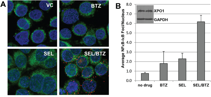 Figure 4: Selinexor promotes NFκB-IκBα binding. A. Proximity ligation assay for 8226B25 PI-resistant MM cells (3x106/ml) treated and stained with antibodies for NFκB and IκBα. Selinexor (KPT-330) in combination with BTZ increased proximity co-localization of NFκB and IκBα up to 12-fold over untreated and single-agent BTZ or selinexor. Green fluorescence denotes the cytoplasm, and blue indicates the nucleus (DAPI). B. Selinexor/BTZ significantly increased the number of NFκB-IκBα foci in the nucleus versus no drug or single-agent selinexor or BTZ (P ≤ 0.00077) (n=3, 50 cells per assay). Inset: Selinexor treatment did not affect XPO1 protein expression at 4 hours as shown by Western blot.