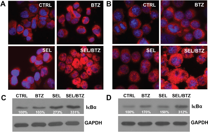 Selinexor-bortezomib increased IκBα protein expression as shown by immunofluorescence microscopy and Western blot
