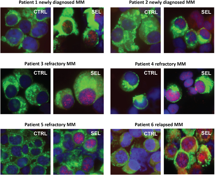 Figure 6: Immunofluorescence microscopy of IκBα in patient MM treated with selinexor. Bone marrow aspirates from newly diagnosed, relapsed, and refractory MM patients were treated ex vivo with 100-300 nM selinexor for 20 hours. MM cells were identified by kappa/lambda light chain antigen staining (green), nuclei identified by DAPI (blue) staining, and IκBα protein (red). All patient MM samples showed an increase in IκBα protein, especially in the cell nuclei with ex vivo selinexor treatment compared with untreated controls from the same patient.