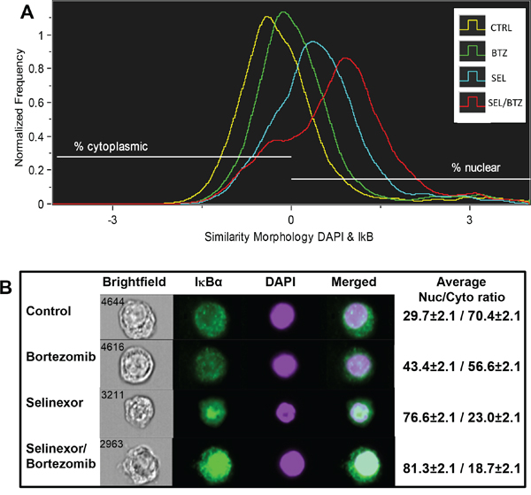 Figure 7: ImageStream flow cytometry. A. 8226B25 human MM cells were treated for 20 hours with BTZ, SEL, or SEL/BTZ. An Imagestream histogram was generated using the similarity feature showing co-localization of IκBα (green) to the nuclear stain, DAPI (purple). IκBα shifted from the cytoplasm to the nucleus in BTZ-treated cells (P = 0.006), further shifted in SEL-treated cells compared with non-treated controls (P = 0.000067). However, the largest nuclear shift was seen in the SEL/BTZ combination treatment (n = 3) (P = 0.000057). B. Images of representative cells in real time, visually showing increased IκBα protein in the cell nuclei. Far right column shows the IκBα nuclear/cytoplasmic ratio for 5000 cells from each treatment group (n =3). *The similarity feature is the log-transformed Pearson correlation coefficient and is a measure of the degree to which two images are linearly correlated within a masked region.