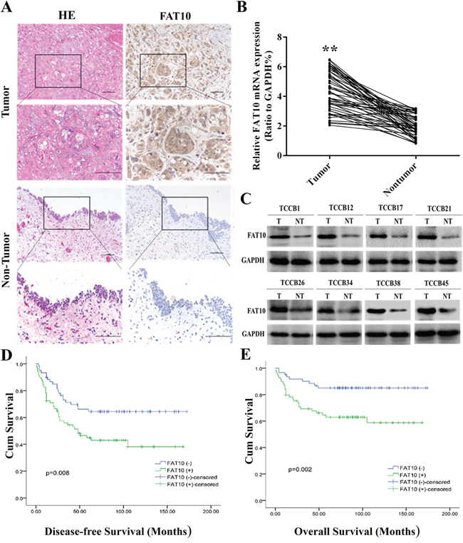 Figure 1: High FAT10 expression is associated with poor prognosis in bladder cancer patients. A. IHC showed that FAT10 protein levels were increased in BC tissues (magnification: 100×, inset magnification: 400×). B and C. qRT-PCR and western blot analysis of FAT10 mRNA and protein levels in BC tissue samples and corresponding adjacent tissues. D and E. Kaplan-Meier survival curves for 133 BC patients. Curves are shown for patients with FAT10-positive tumors and FAT10-negative/weak tumors (**P < 0.01).