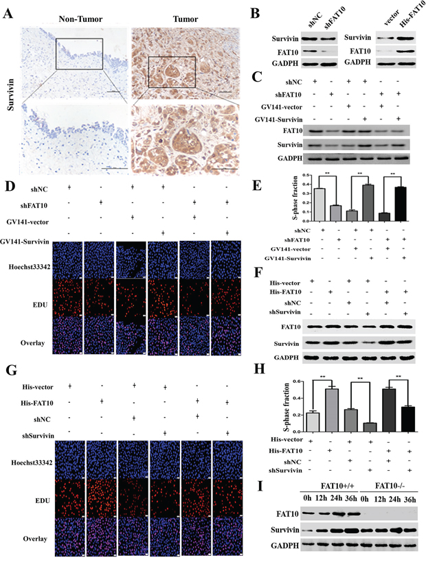 Figure 3: FAT10 promotes Survivin expression and proliferation in BC cells. A. IHC showed that Survivin protein was upregulated in BC tissue (magnification: 100×, inset magnification: 400×). B. Western blot analysis of Survivin expression in BC cell lines transfected with the shFAT10 plasmid or the His-FAT10 plasmid. C. Survivin overexpression attenuated the reduction in Survivin expression in 5637-shFAT10 cells. D and E. Edu assays showed that Survivin overexpression rescued cell proliferation in 5637-shFAT10 cells. (**P<0.01). F. Survivin knockdown successfully decreased Survivin expression in UM-UC-3-FAT10 cells. G and H. Edu assays showed that Survivin knockdown decreased proliferation in UM-UC-3-FAT10 cells (**P<0.01). I. Survivin levels were detected in IFN-γ/TNF-α-treated FAT10 KO cells by western blotting.