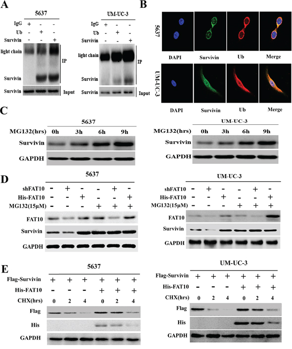 Figure 4: FAT10 increases Survivin levels by inhibiting Survivin protein degradation in BC cells. A. Co-IP for Survivin and ubiquitin in 5637 and UM-UC-3 cells. B. Co-localization of ubiquitin and Survivin in 5637 and UM-UC-3 cells; ubiquitin (1:200) in red, Survivin (1:200) in green, DAPI nuclear counterstaining in blue. C and D. 5637 and UM-UC-3 cells were treated with MG132 (15 μM) for the indicated times, and Survivin levels were detected by western blotting. E. 5637 and UM-UC-3 cells were treated with CHX (20 μM) for the indicated times, and Survivin levels were detected by western blotting.