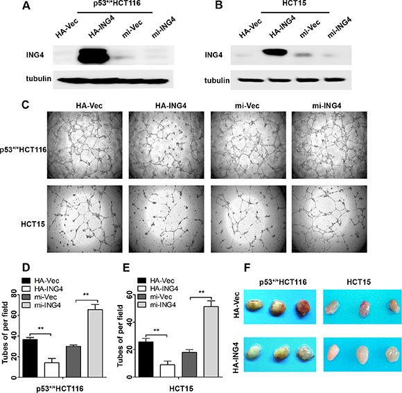 Figure 2: Expression of ING4 in CRC cells negatively regulated tube formation in vitro and inhibited blood vessel formation in vivo. (A–B) Western blot was used to test the ING4 expression in the p53+/+HCT116 and HCT15 cells with ING4 overexpression (HA-ING4), ING4 knockdown (mi-ING4) and respective vector control (HA-Vec and mi-Vec). (C) ING4 in CRC cells negatively regulated tube formation. (D–E) Numbers of complete tubular structures formed by HUVECs were counted for ING4 overexpressed, knocked down and control groups (n = 3/group) in CRC cells. (F) Photographs of matrigel plugs with ING4 overexpressed or control p53+/+HCT116 and HCT15 cells excised from mice after 10 days of growth in vivo. Data are presented as means ± standard deviations. *P < 0.05, **P < 0.001 (Student’s t-test).