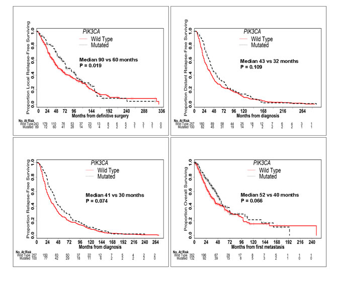 Figure 3: PIK3CA Mutation is Associated with Better Outcomes. Kaplan-Meier curves of LRFS, DRFS, RFS and OS in patients with and without PIK3CA mutations. PIK3CA mutation was associated with significantly better LRFS, RFS and OS and a trend towards better DRFS.