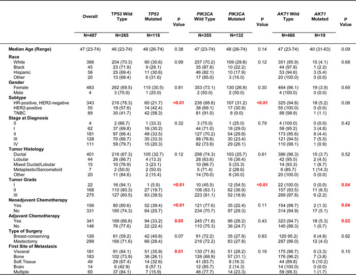 For clinical analysis, four of the 500 patients were excluded because they did not start systemic therapy at the time of diagnosis. Nine additional patients were excluded because they developed contralateral breast cancer prior to metastatic disease. After exclusion, 343 patients (70.4%) had HR-positive and HER2-negative breast cancer, 55 (11.3%) had HER2-positive disease regardless of HR status and 89 (18.3%) had TNBC. Table 1 summarizes the patient characteristics, overall and by mutation in TP53, PIK3CA or AKT1. Patients with TNBC had a higher rate of TP53 mutation (58.3%) than HER2-positive (42.4%) and HR-positive (21.7%) patients. Conversely, PIK3CA mutation rate was lower in TNBC (9.0%) than HER2-positive (30.9%) and HR-positive (31.2%) disease. All 19 AKT1 mutated cases were HER2-negative, and 18 out of 19 cases were HR-positive. In patients with grade III tumors, the incidence of TP53 mutation (39.5%) was higher than the incidence of PIK3CA mutation (18.9%) or AKT1 mutation (2.2%). Similarly, patients with intracranial disease as their first site of distant disease had a higher incidence of TP53 mutation (57.1%) compared to PIK3CA mutation (14.3%) or AKT1 mutation (0%). There were no significant differences in the mutation rates based on metastatic site tested.