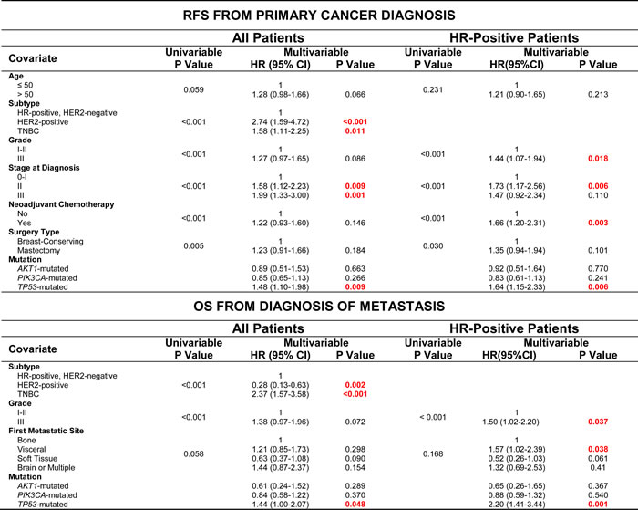 In univariable analysis of OS, clinical subtype, tumor grade, stage at diagnosis and first site of distant metastatic disease were significant or marginally significant predictors of OS (Table 3). After multivariable analysis with stratification of stage, only tumor subtype and presence of TP53 mutation remained significant predictors. In HR-positive patients, grade III disease, visceral metastatic disease and TP53 mutation were significant predictors of OS after multivariable analysis. Again, in both the entire cohort and HR-positive patients, PIK3CA and AKT1 mutations were not significant predictors of OS after multivariable analysis.