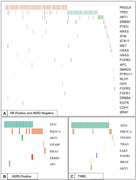Mutations in TP53 and PIK3CA have previously been identified as of fundamental importance in cancer pathogenesis and resistance to therapy.[17-19]. The Cancer and Genome Atlas Project (TCGA) reported a high frequency of TP53 (37%) and PIK3CA (36%) mutations in breast cancer patients.[11] TP53 mutations were seen in the majority of basal-like cancers (80%), which is comprised mainly of TNBCs, and only in a minority of patients with Luminal A cancers (12%), which are strongly ER-positive tumors of low grade. Conversely, PIK3CA mutation was seen in 45% of Luminal A tumors, 39% of HER2-positive tumors and 9% of basal-like tumors. Similarly, sequencing of the METABRIC cohort revealed higher rates of TP53 mutations in basal-like patients (65%) than Luminal A patients (9%).[20] We also found that that TP53 mutation was more frequently encountered in TNBC patients, and PIK3CA mutation was more frequently encountered in HR-positive and HER2-positive patients. The incidence of TP53 and PIK3CA mutation was comparatively lower in our cohort, and this is at least in part attributable to the platforms used in our study, as we assessed only hotspot mutations.