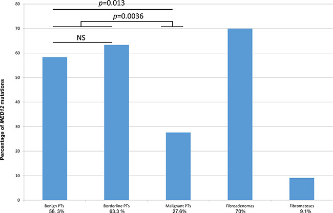 Figure 1: MED12 mutation status in PTs (according to grade), FAs and fibromatosis.
