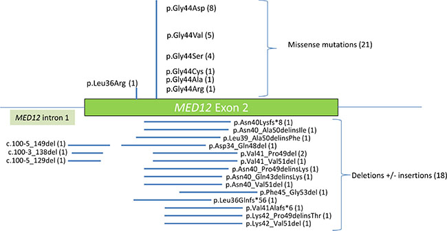 Figure 2: Diagram showing the distribution of MED12 exon 2 mutations detected in this study. The number of each alteration is indicated in parentheses.