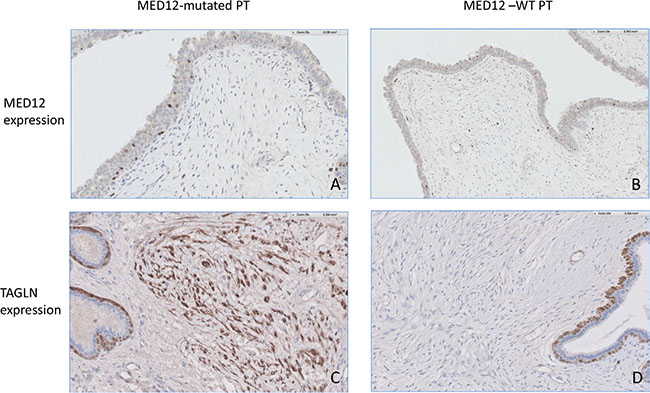 Figure 3: (A) Focal MED12 nuclear expression in the stromal component of a MED12-mutated PT. × 20 objective. (B) Focal MED12 nuclear expression in the stromal component of a MED12-WT PT. × 20 objective. (C) High TAGLN expression in the stromal component of a MED12-mutated PT. × 20 objective. Note the TAGLN expression by myoepithelial cells. (D) Low TAGLN expression in the stromal component of a MED12-WT PT. ×20 objective. Note the TAGLN expression by myoepithelial cells.