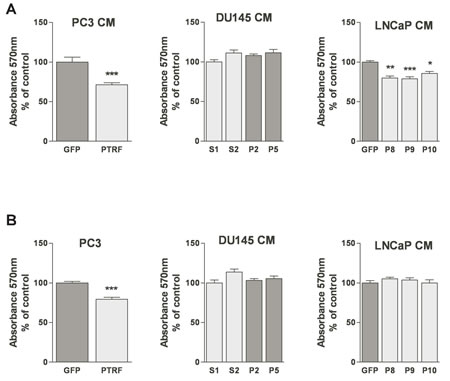 Figure 2: Effect of PTRF expression in prostate cancer cells on endothelial cell viability. (A) BAEC and (B) LEC proliferation after treatment with various prostate cancer cell-conditioned medium was tested using the MTT assay. Results are reported as percent of the viability of ECs to the control cells (n=3) *P<0.05, **P<0.01 and ***P<0.001.