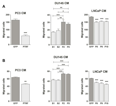Figure 3: Effect of PTRF expression in prostate cancer cells on endothelial cell three-dimensional chemotaxis. (A) BAEC and (B) LEC were tested for their ability to migrate in a modified Boyden chamber assay toward various prostate cancer cell-conditioned media. Results are reported as percent of the migration to the control cells (n=3-5) *P<0.05, **P<0.01 and ***P<0.001.