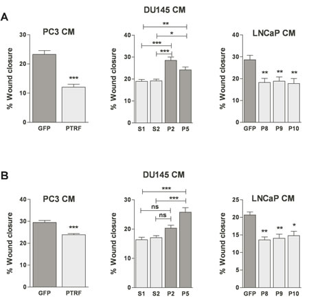 Figure 4: Effect of PTRF expression in prostate cancer cells on endothelial cell two-dimensional chemokinesis. (A) BAEC and (B) LEC were tested for their ability to migrate randomly in the wound healing assay. Wounded EC monolayers were exposed to various prostate cancer cell-conditioned media for 6 h. Results are reported as percent of wound closure (n=3-6) *P<0.05, **P<0.01 and ***P<0.001.