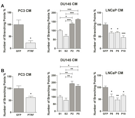 Figure 5: Effect of PTRF expression in prostate cancer cells on in vitro angiogenesis and lymphangiogenesis. (A) BAEC and (B) LEC were tested for their ability to differentiate into tube-like structures on MatrigelTM when exposed to various prostate cancer cell-conditioned media for 6 hr. Results are reported as percent of branching points compared to control cells (n=3) *P<0.05, **P<0.01 and ***P<0.001.