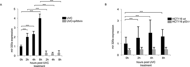 Figure 3: Mir320a induction in response to UVC radiations depends on p53. A. HeLa cells were pre-treated with 25μM of the p53 inhibitor pifithrin-α for 2h followed by exposure to 10J/m2 UVC rays. Mir320a expression levels were analyzed by real time RT-PCR at the indicated time points. The 5S rRNA expression levels were used as a normalization control. Statistically significant differences between various conditions were evaluated by Anova/Tukey (*** p<0.001; n=3). Error bars denote relative S.D. B. HCT116 wt and HCT116 p53–/– were exposed to 10J/m2 UVC radiation and mir320a levels were measured by real time RT-PCR at the indicated time points. The 5S rRNA expression levels were used as a normalization control. Statistically significant differences between various conditions were evaluated by Anova/Dunnett (*** p<0.001; n=3). Error bars denote relative S.D.