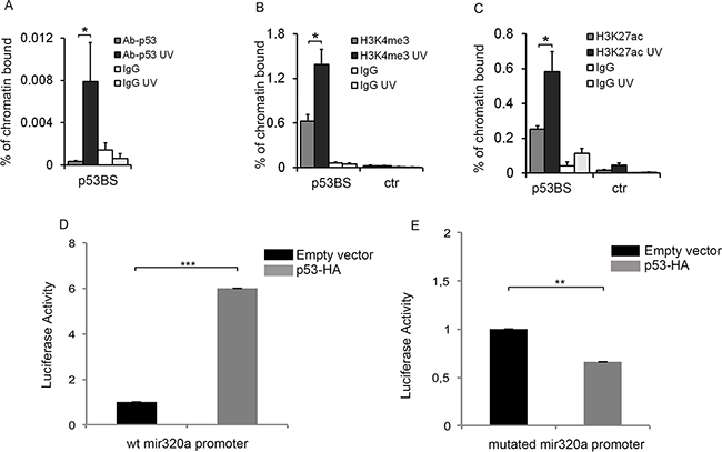 We then wondered whether UV-induced mir320a up-regulation could be part of the p53-orchestrated response to genotoxic stress. We found that the UVC-dependent mir320a increase was abrogated both in HeLa through chemical inhibition of p53 and in HCT cells devoid of p53. Moreover, mir320a pattern of expression upon UVC treatment is consistent with the expression/activation of p53 previously reported with an increase at 6 and 12 hours and reduction at 24 hours [50]. In silico analysis of the mir320 locus identified putative p53 binding sites and our CHIP-qPCR data demonstrated not only that p53 effectively binds the predicted p53BS upstream the mir320 gene, indicating a direct role of p53 in UVC-dependent mir320a upregulation, but also that this region lies within an active promoter. Consistently, ENCODE data reveals strong signals of H3K4me3 and H3K27ac, two markers known to identify active regulatory regions including promoters [51, 52], in the genomic region upstream of miR320a, which includes the p53BS. Altogether, our ChIP data demonstrated that both H3K4me3 and H3K27ac signals in the mir320a promoter are increased upon UVC treatment, indicating that the promoter activity of this region is responsive to UV radiation-induced p53 action. Finally, analysis of the activity of such promoter region, upstream of a luciferase reporter, showed that p53 was able to trigger reporter activation through the predicted binding site but not through its mutated form.