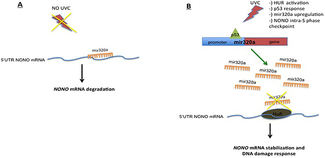 Overall our findings reveal a new mechanism whereby HUR protects NONO for mir320a-mediated degradation in response to UVC-induced DNA damage. Moreover our data identify a new component within the complex network of players underlying the DDR adding mir320a to the list of p53-regulated targets upon genotoxic stress.