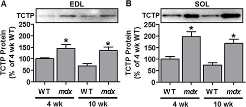 Figure 1: TCTP protein is elevated in dystrophic mdx mouse skeletal muscle. Representative images and quantification of the Western blot analysis for TCTP in wild type (WT) and mdx extensor digitorum longus (EDL; A) and soleus (SOL; B) muscles at 4 and 10 wk of age. All values are expressed as a percentage of the values obtained from the 4 wk WT muscles. Values are reported as the mean + SEM, n = 5–9 / group. *Significantly different from WT muscles in the respective age group, P ≤ 0.05.