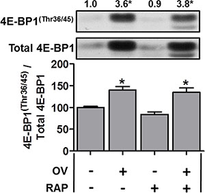 Figure 3: The mechanical overload-induced increase in 4E-BP1(Thr36/45) phosphorylation is not inhibited by rapamycin. Plantaris muscles from wild-type FVB/N mice were subjected to mechanical overload (OV+) or sham (OV−) surgeries. Following surgery, the mice were administered a daily regime of either vehicle (RAP−) or 0.6 mg.kg–1 rapamycin (RAP+) injections. At 7 days post-surgery, the plantaris muscles were collected and subjected to Western blot analysis for 4E-BP1(Thr36/45) phosphorylation, and total 4E-BP1. All values are expressed relative to the values obtained from the sham vehicle treated muscles. Values in the graph are reported as the mean + SEM. The values at the top of the representative blot indicates the mean value for 4E-BP1(Thr36/45) phosphorylation, n = 6–7/group. *Significant effect of OV within a given drug treatment, P ≤ 0.05.