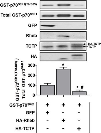 Figure 6: The effect of TCTP overexpression on mTOR signaling in skeletal muscle. Wild type FVB/N mouse TA muscles were co-transfected with GST-tagged p70S6K1 (GST-p70S6K1) and GFP as a negative control, HA-tagged Rheb as a positive control or HA-tagged TCTP. At 3 days post-transfection, the muscles were collected and subjected to Western blot analysis with the indicated antibodies. The phosphorylated to total protein ratio for GST-P-p70S6K1(Thr389) was calculated and expressed as a percentage of the values obtained in the GFP control samples. Arrows on the right hand side of the TCTP panel indicate bands representing endogenous TCTP and HA-tagged TCTP. Values are reported as the mean + SEM, n = 4 / group. *Significantly different from the values obtained in GFP transfected muscles, #significantly different from the values obtained in Rheb transfected muscles. P ≤ 0.05.