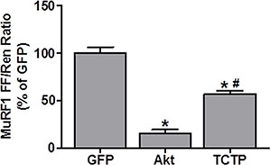 Figure 8: TCTP inhibits MuRF1 promoter activity. Wild type FVB/N mouse TA muscles were co-transfected with GFP as a negative control, HA-tagged Akt as a positive control or HA-tagged TCTP, as well as the pRL-SV40 Renilla (Ren) luciferase reporter, and the MuRF1 promoter firefly (FF) luciferase reporter. At 3 days post-transfection, the muscles were collected and FF and Ren luciferase activities were measured with a dual-luciferase assay. Measurements of the relative light units produced by FF luciferase were normalized to that produced by Ren luciferase and this ratio was expressed as a percentage of the values obtained in the GFP transfected muscles. Values are reported as the mean + SEM, n = 4–5/group. *Significantly different from the GFP-transfected muscles. #Significantly different from Akt-transfected muscles, P < 0.05.