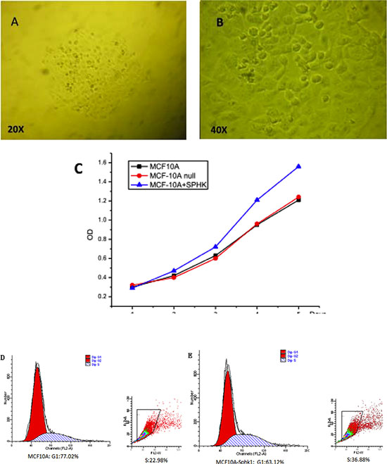 Figure 1: (A and B) Isolated single MCF10A clones after transduction with a lentivirus vector. Single clones were visualized through microscopy. (C) Sphk1 overexpression promoted the proliferation of MCF10A breast epithelial cells. (D and E) Effect of Sphk1 overexpression on the cell cycle.
